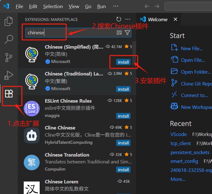1.安装中文插件(可选),点击扩展,在搜索框中输入“Chinese”,点击“Install”安装