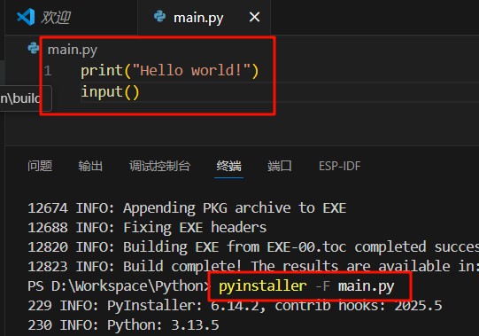 2.运行打包命令,在终端输入“pyinstaller -F main.py”,将main.py文件打包成单个可执行文件。