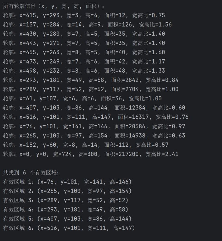 x/y坐标(左上角)、宽高、面积和宽高比,方便用户根据实际输出调整后续筛选条件(如某类验证码字符面积普遍为 500-1000,可据此优化面积阈值)。