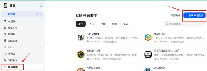 我们进入豆包,在左侧菜单栏中,点击【更多】,找到【AI智能体】,再点击右上角的【创建智能体】,