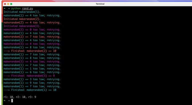 print(f"{color}---> Finished: makerandom({delay}) == {number}" + COLORS[0])