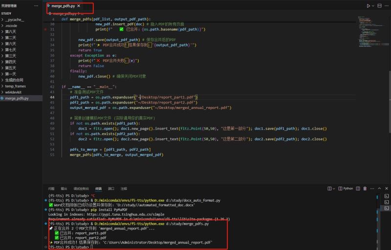 方案: 编写一个Python脚本,指定多个源PDF文件,PyMuPDF将它们快速拼接成一个大的PDF文档,实现PDF合并的自动化。