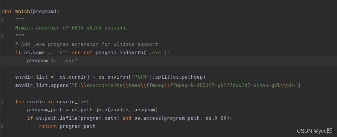 报错应该会给一个"pydub"中的一个叫“utils.py”文件的路径, 第一步:找到该文件 第二步:找到一个叫"which(program)"的函数 第三步:添加前面下载的"ffmpeg"的“bin”文件路径 第四步:重启电脑
