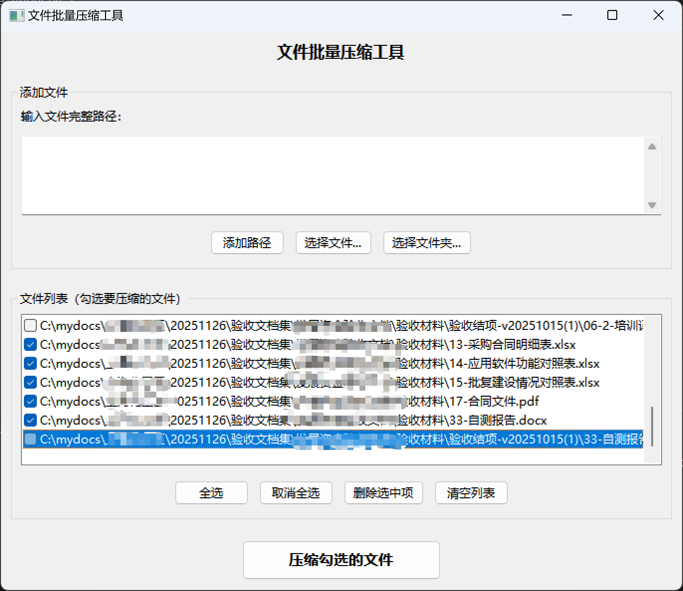 - 在列表中勾选需要压缩的文件(默认全部勾选)