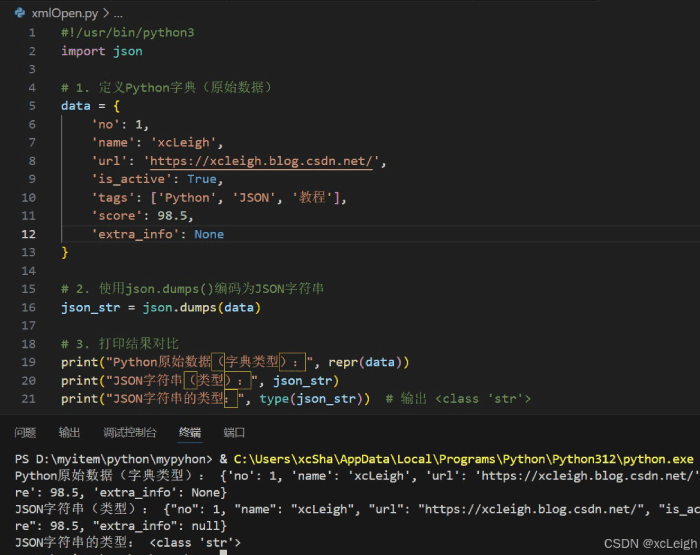 JSON字符串(类型): {"no": 1, "name": "xcLeigh", "url": "https://xcleigh.blog.csdn.net/", "is_active": true, "tags": ["Python", "JSON", "教程"], "score": 98.5, "extra_info": null}