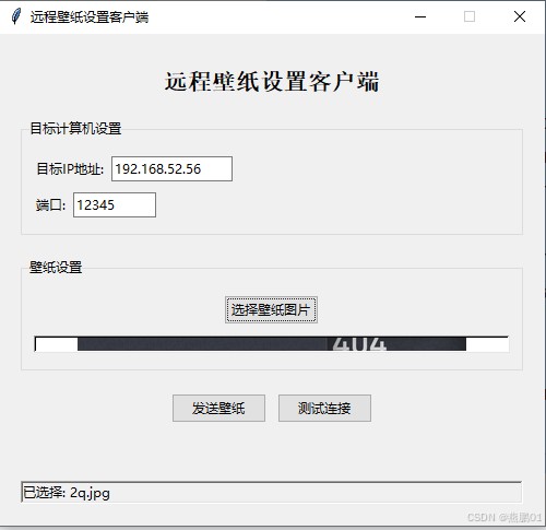 今天我要分享一个实用的远程壁纸设置系统,包含一个图形界面的发送端和一个后台运行的服务端,这个系统可以让你轻松地将本地图片设置为远程计算机的桌面壁纸,非常适合办公室环境、家庭网络或需要统一壁纸设置的场景,需要的朋友可以参考下