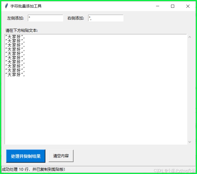 "),结尾添加什么(比如",)。 - 操作按钮:点击后自动处理文本,并将结果复制到剪贴板。