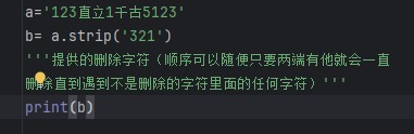 5.strip:从某个字符串中删除指定字符串中的任意字符。从字符串两端开始删除,直到遇到第一个不在指定字符串中的字符就停下