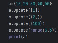 集合.update(元素)作用:向集合中批量添加元素(接受可迭代对象例如:列表,元组,集合)