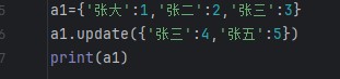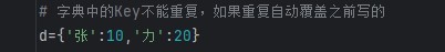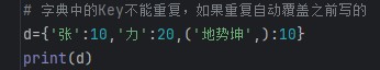 2.键唯一;字典中的键(key)不能重复,若重复则后写的会覆盖前写的。