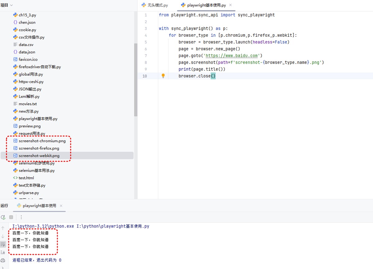 这段代码使用Playwright库自动化操作三种主流浏览器(Chromium、Firefox、WebKit),访问百度首页,对每个浏览器进行截图并打印网页标题