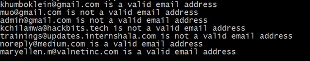 在代码片段中,有一个电子邮件地址列表。for 循环遍历列表中的所有电子邮件地址。在for 循环中,一封电子邮件正在被单独验证。
