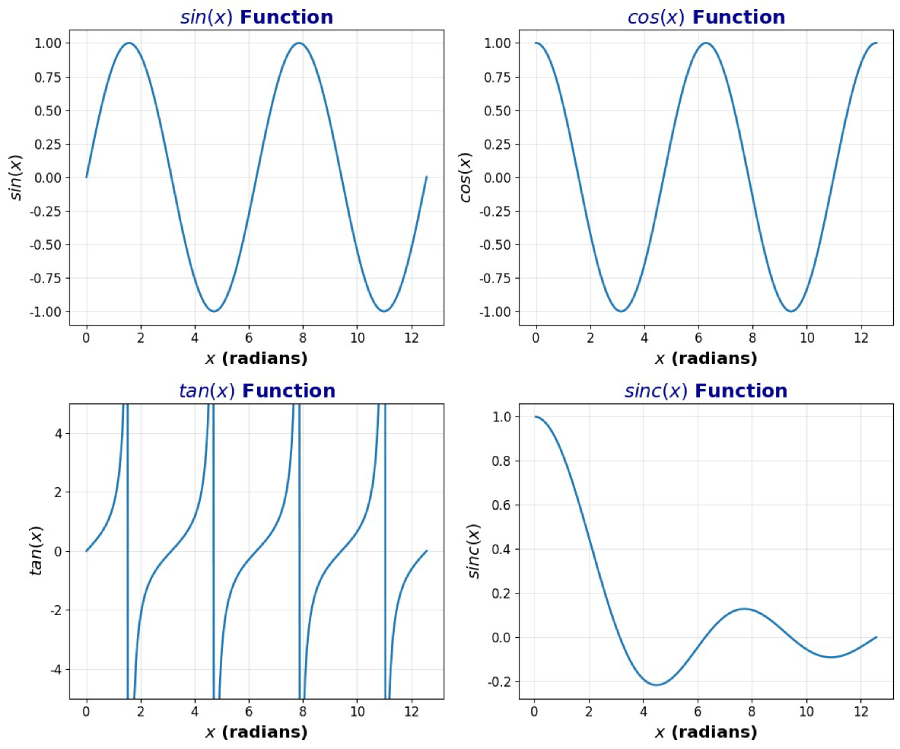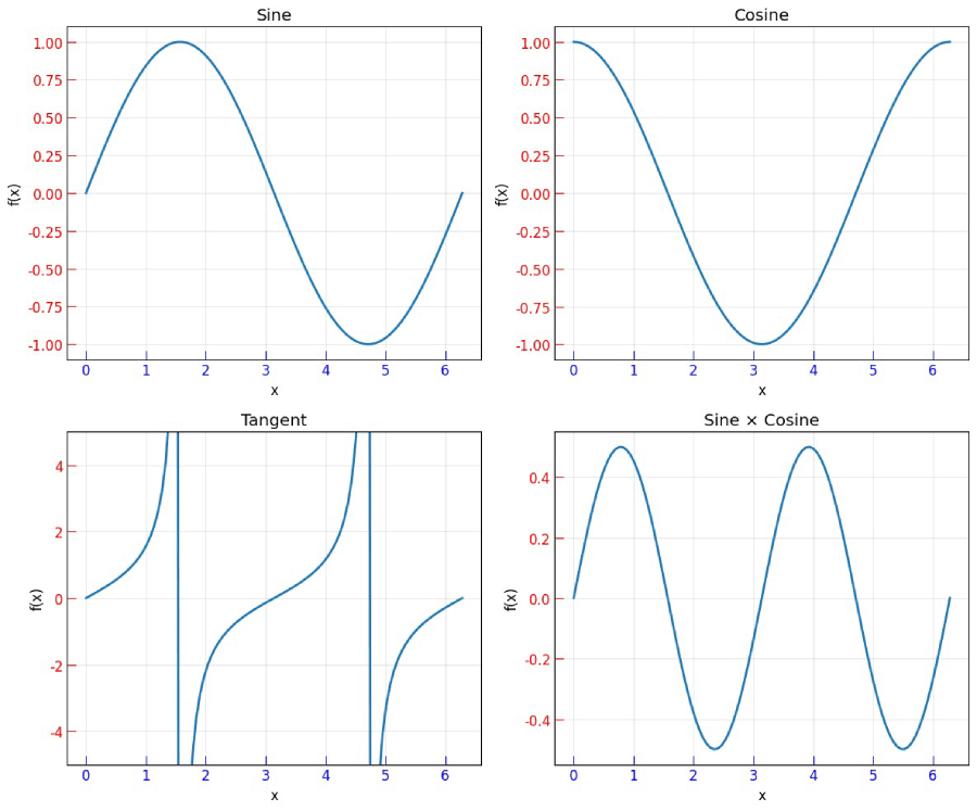 titles = ['Sine', 'Cosine', 'Tangent', 'Sine × Cosine']