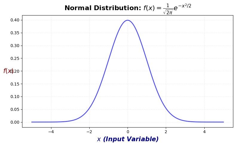 ax.set_title('Normal Distribution: $f(x) = \\frac{1}{\\sqrt{2\\pi}} e^{-x^2/2}$',
