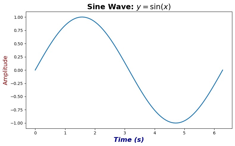 ax.set_title('Sine Wave: $y = \\sin(x)$', fontsize=18, fontweight='bold')