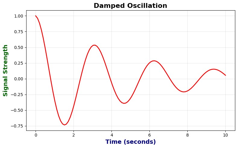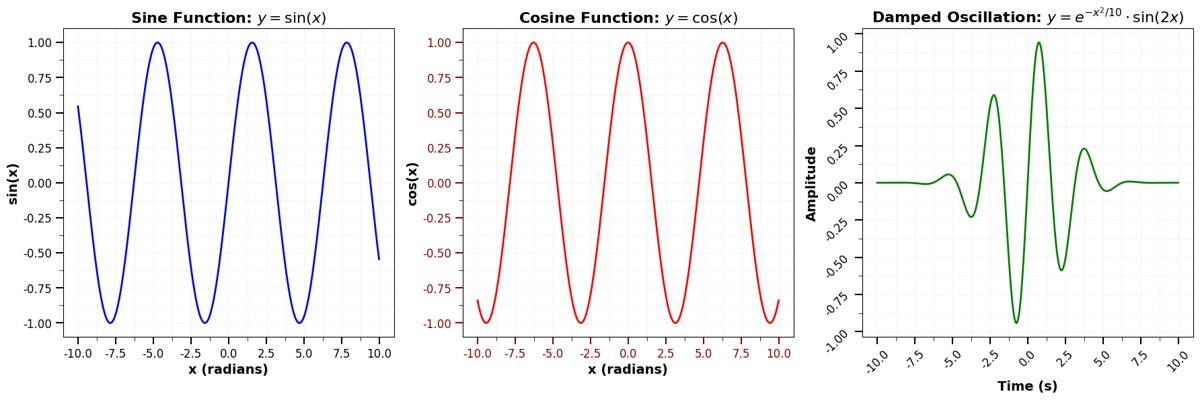 axes[2].set_title('Damped Oscillation: $y = e^{-x^2/10} \\cdot \\sin(2x)$', fontsize=16, fontweight='bold')