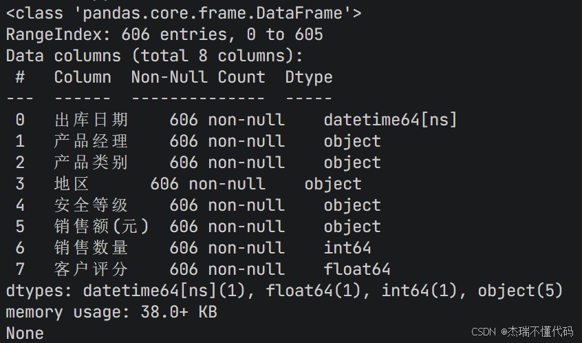 print(df.info()) # 显示数据框的信息,包括列名、非空值数量、数据类型等