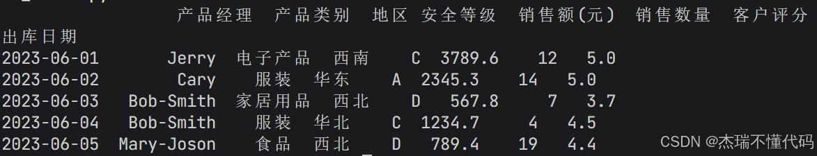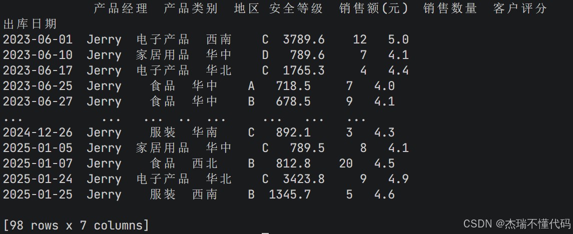 # 显示产品经理为Jerry且安全等级为D的所有数据 print(df.loc[(df["产品经理"]=="Jerry")&(df["安全等级"]=="D"),:]) # 显示产品经理为Jerry且安全等级为D的销售额和地区 print(df.loc[(df["产品经理"]=="Jerry")&(df["安全等级"]=="D"),["销售额(元)","地区"]])
