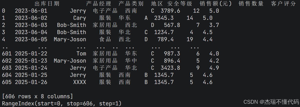 可以看到,打印出了开始5行和最后的五行,最左侧的一列数字是pandas的标识符,用于标识每一行的位置,在df输出的最后,也告知了数据源的形状,是606行*8列。当然如果看的是csv文件,可以把read_excel()改成read_csv()。