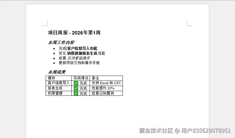 运行这段代码后,您将在同一目录下找到一个名为output.docx的Word文档,其中包含了example.md的所有内容,并且基本格式(如标题、列表、粗体、链接等)都已正确转换。