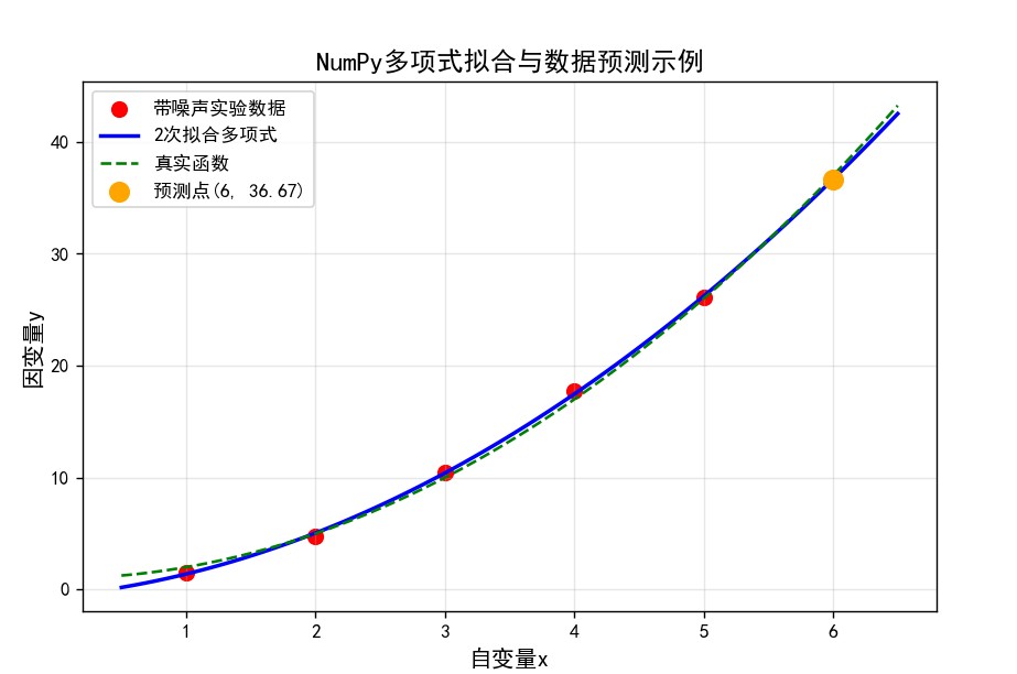 np.polyfit得到的拟合模型,几乎贴合所有红色散点,说明模型成功捕捉了数据的二次函数趋势,消除了噪声干扰。 - 橙色大点(预测点):对应 (x=6) 时的预测值,落在蓝色拟合曲线上,且接近绿色虚线的理论值(37),直观体现了拟合模型对 “未知数据” 的预测能力。