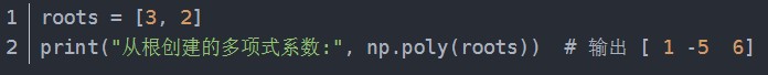 print("多项式的根:", roots) # 输出:[3. 2.],即x=2和x=3是方程的解