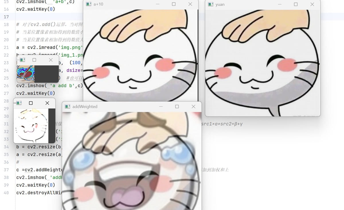 c =cv2.addWeighted(a, 0.5,b, 0.5, 10) # 10:图像的亮度值(常数),将添加到加权和上