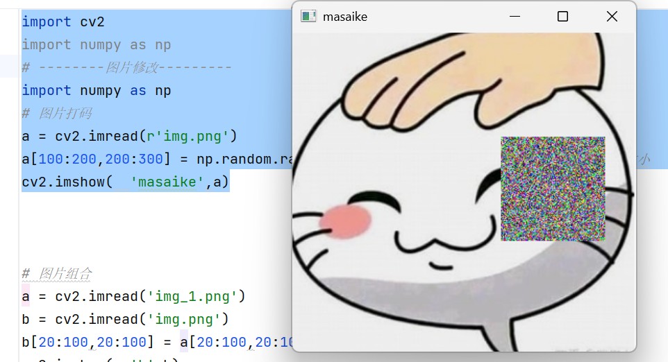 import cv2 import numpy as np # 图片打码 a = cv2.imread(r'img.png') a[100:200,200:300] = np.random.randint(0,256,(100,100,3))#矩阵赋值必须是相同大小 cv2.imshow( 'masaike',a)