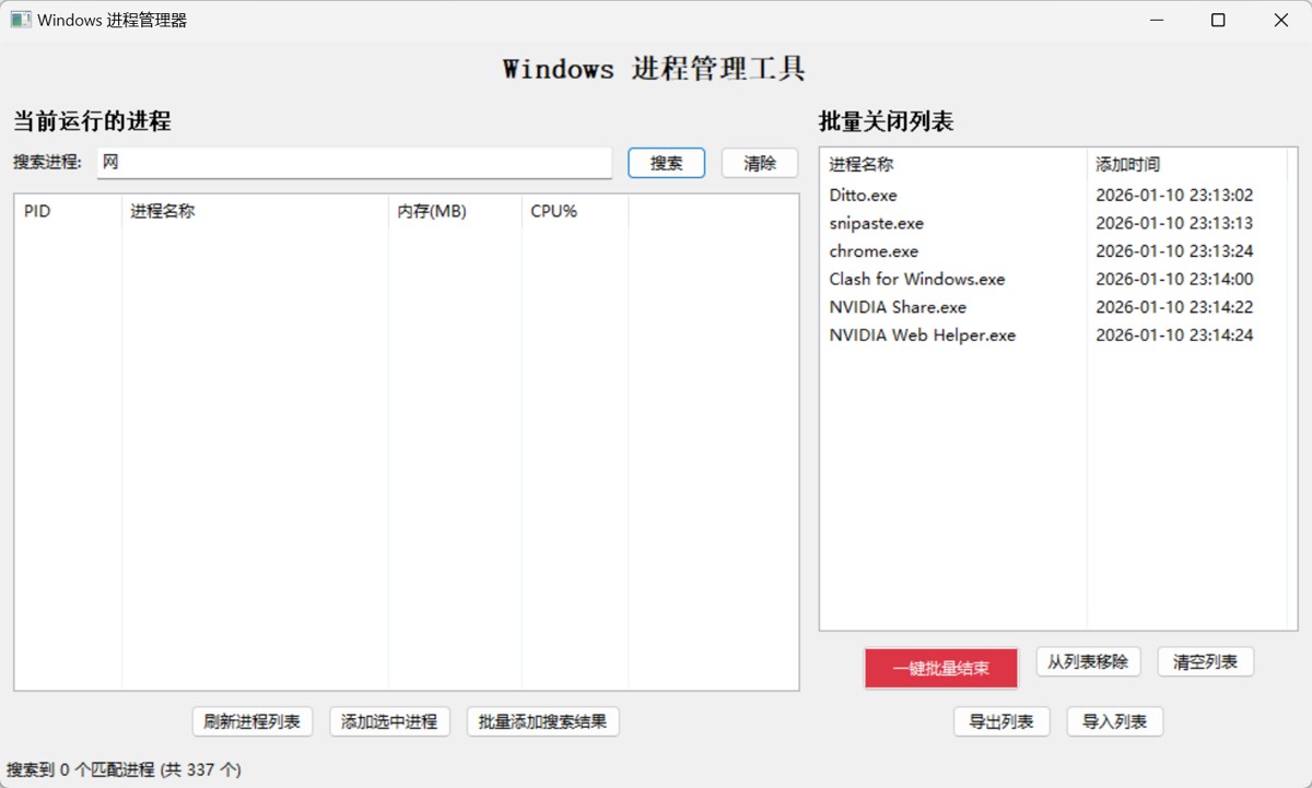 - 批量管理:支持将多个进程添加到批量关闭列表