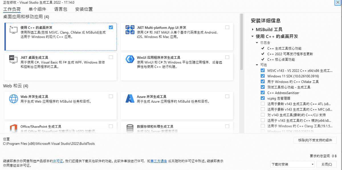 - “使用 C++ 的桌面开发”(核心组件,必须选择)。