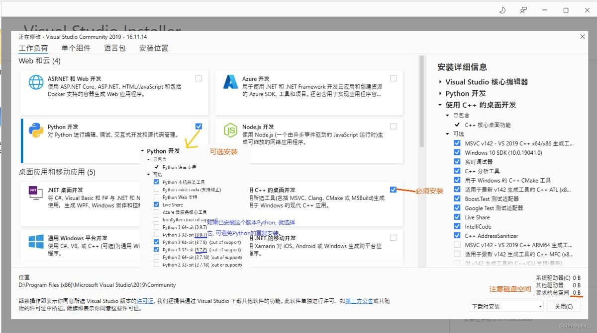启动VisualStudioSetup.exe, 必须选择C++开发, 可选Python开发, 点击安装。