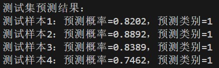 4 个测试样本均被预测为类别 1,预测概率在 0.76~1.0 之间: