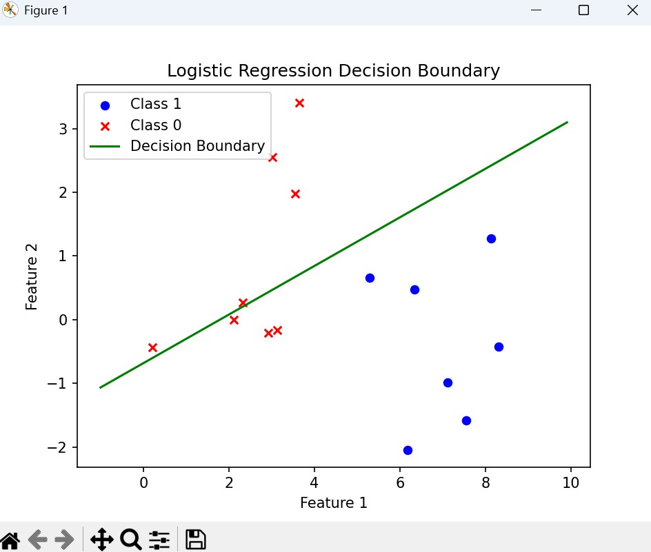 y = (-weights[0, 0] - weights[1, 0] * x) / weights[2, 0]