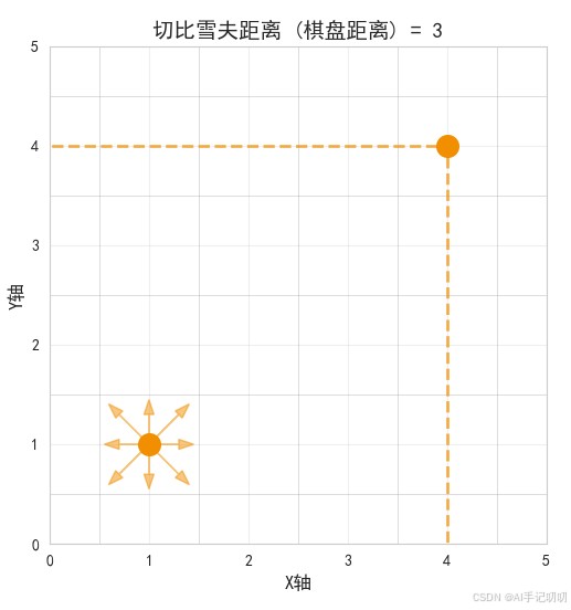 切比雪夫距离,也称为“棋盘距离”,是指两点之间各坐标数值差的最大值。