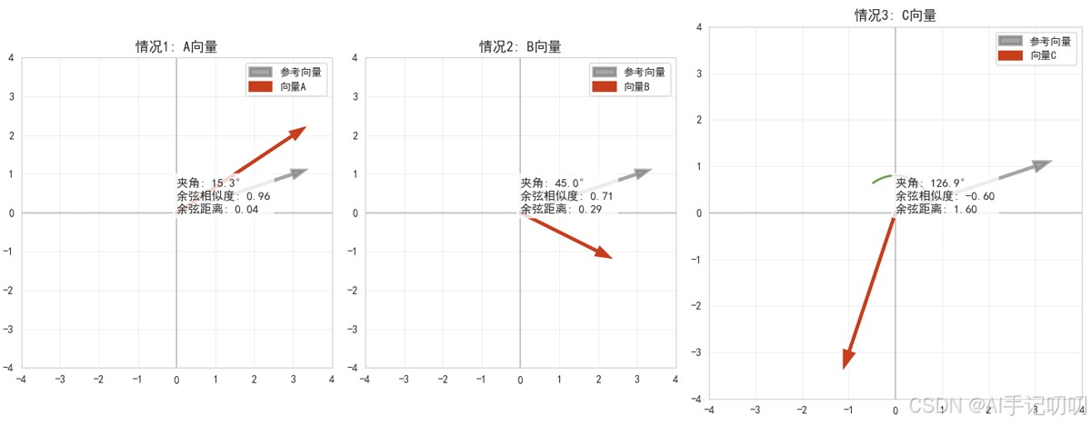 注:对于零向量,余弦相似度通常定义为0,因此余弦距离为1