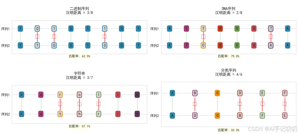 汉明距离用于比较两个等长字符串或序列的不同位置数量,主要用于编码理论和信息论。