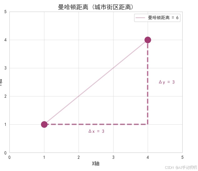 曼哈顿距离,也称为“城市街区距离”或“L1距离”,是指两点在标准坐标系上的绝对轴距总和。