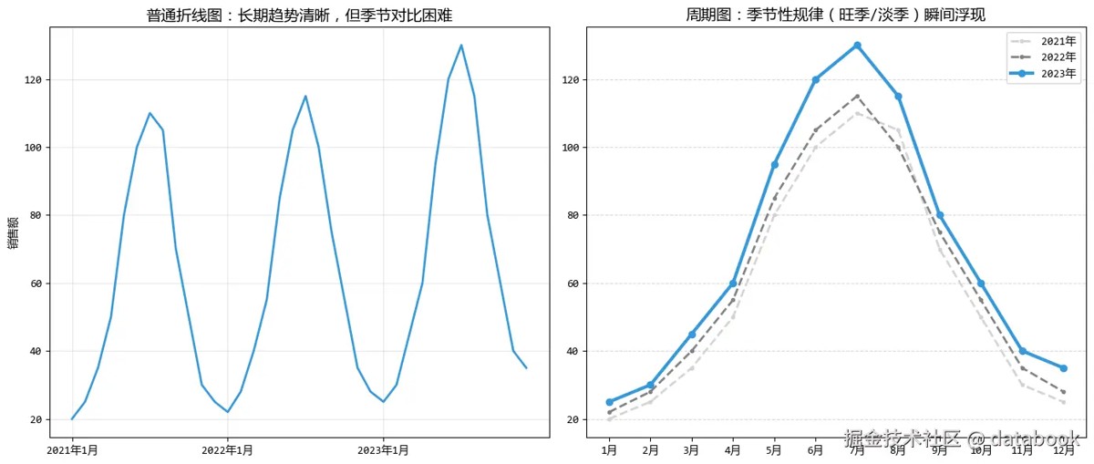 - 右图(周期): 就像把每年的数据“叠”在了一起。你可以直接看到,无论哪一年,7月都是最高峰,而12月都是低谷。规律一目了然。