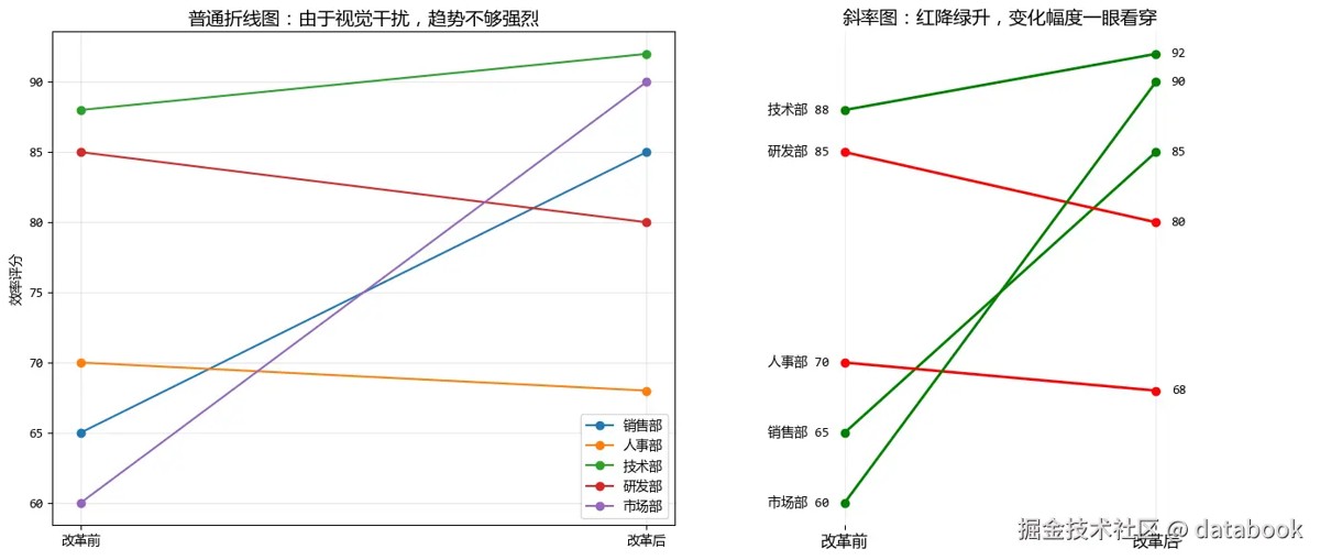 - 斜率图:适合比较两个时间点的变化,直观展示变化幅度