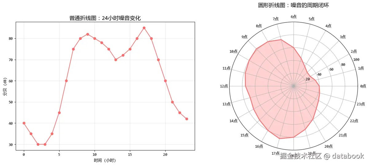 - 圆形折线图:适合展示周期性数据,首尾相接的设计强调循环