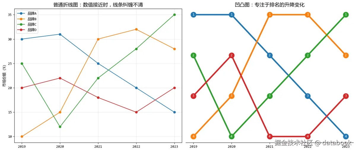 - 凹凸图:适合展示排名或相对位置的变化,竞争关系一目了然