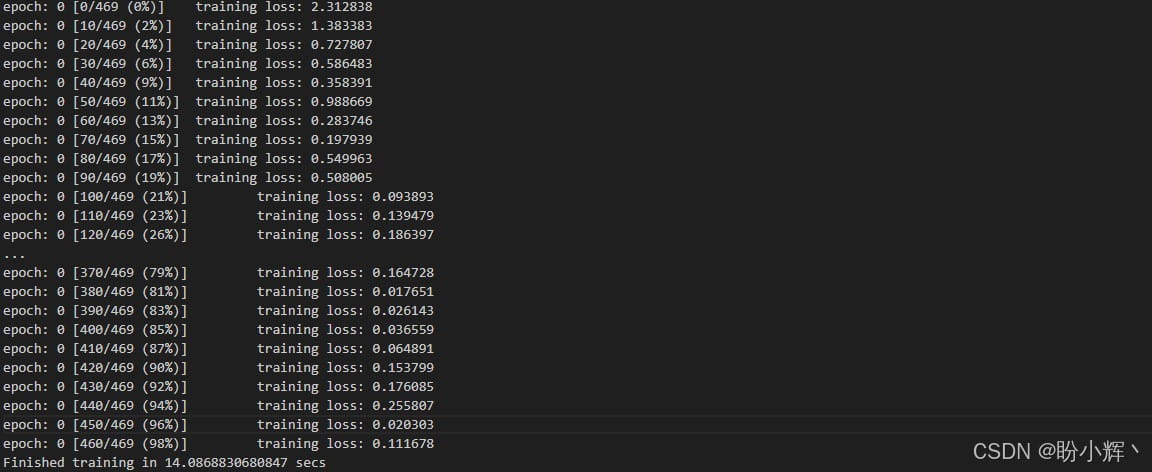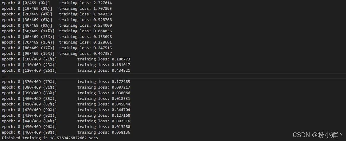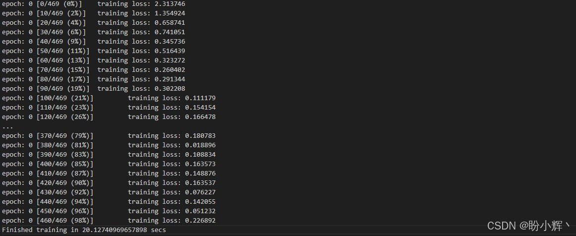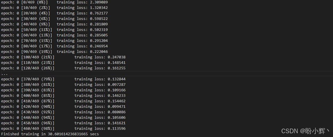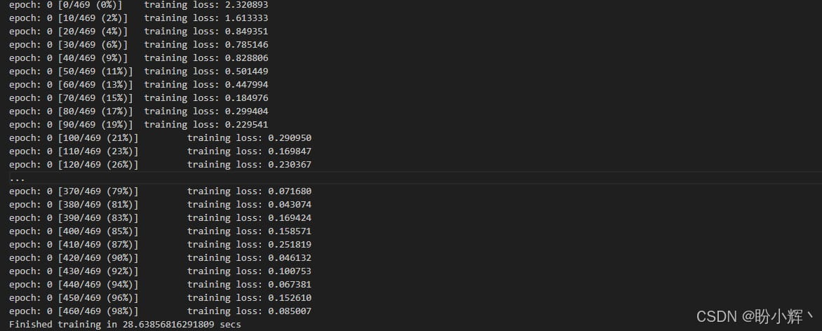 训练 1 个 epoch 大约花费了 28 秒,一个 epoch 共包含 469 个批次,实际训练时间会随硬件配置差异而波动。