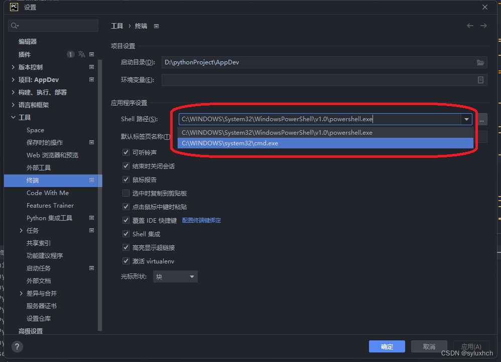 如果想让Pycharm默认显示项目所在虚拟环境,而不是系统基本环境,可以在设置里面更改,点击设置即可进入修改页面,也可以通过文件/File-设置/setting/-工具/Tools-终端/Terminal步骤,进入下面界面