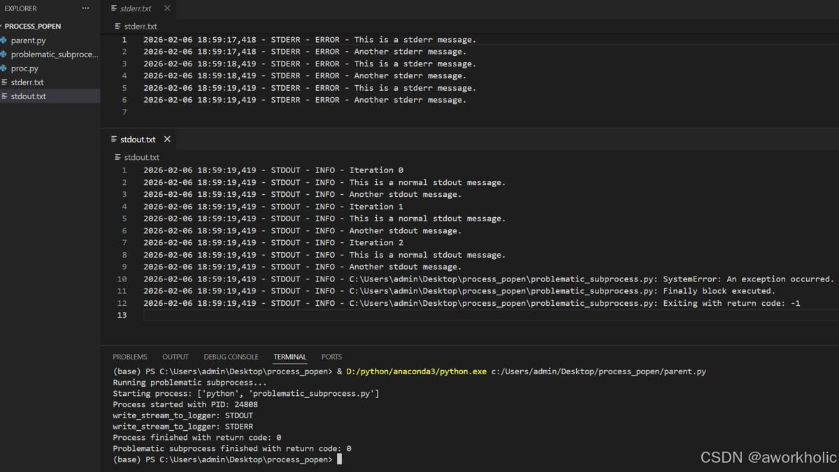 注意,这里在使用popen打开进程,使用了2个线程读取标准输出、标准错误输出, 将原进程输出分别重定向到对应的日志文件中。日志的的写入,使用了logging库。最后等待进程退出。