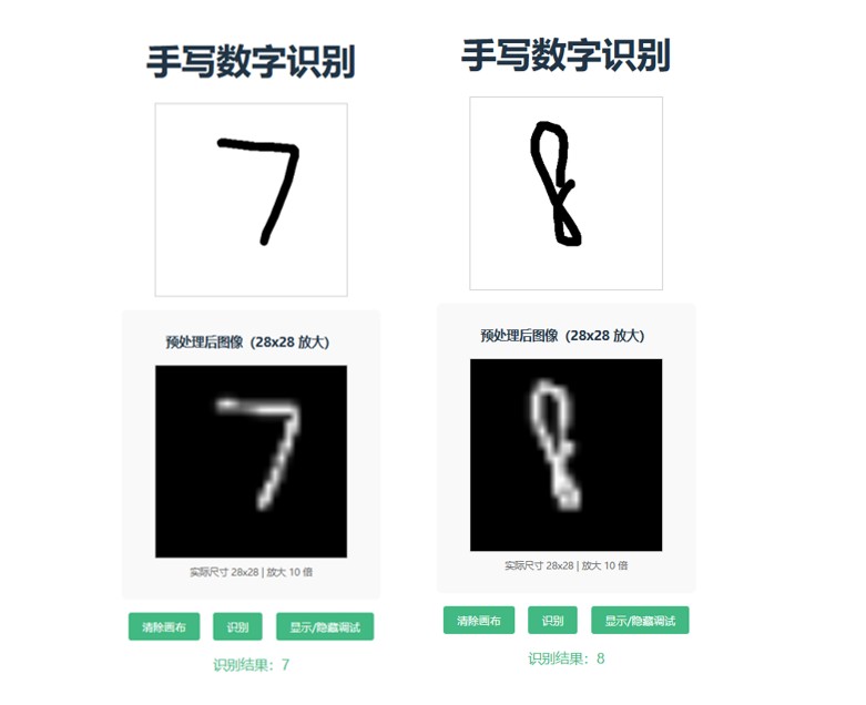 显示/隐藏调试,查看28×28预处理图像。 - 点击
