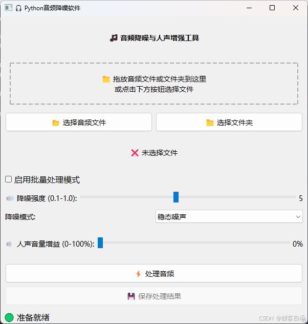 本项目是基于PyQt5和Librosa开发的桌面级音频处理工具,主要特点: