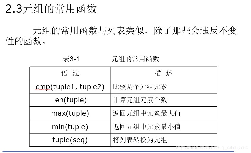 其他序列(列表和字符串)的操作都可用于元组,除了那些会违反不变性的列表运算符。“+”和“*”运算符同样适用于元组。成员操作(in)和for循环同样适用于元组长度(len)、最大(max)和最小(min)同样适用于元组。
