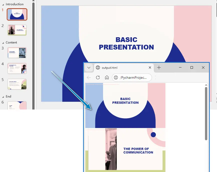 在实际项目中,这种技术非常适合用于构建在线演示系统、企业培训平台或自动化报告发布流程。借助 HTML 输出格式,演示文稿可以更方便地集成到网站、学习管理系统(LMS)或内部知识平台中,实现无需 PowerPoint 即可浏览内容的效果。