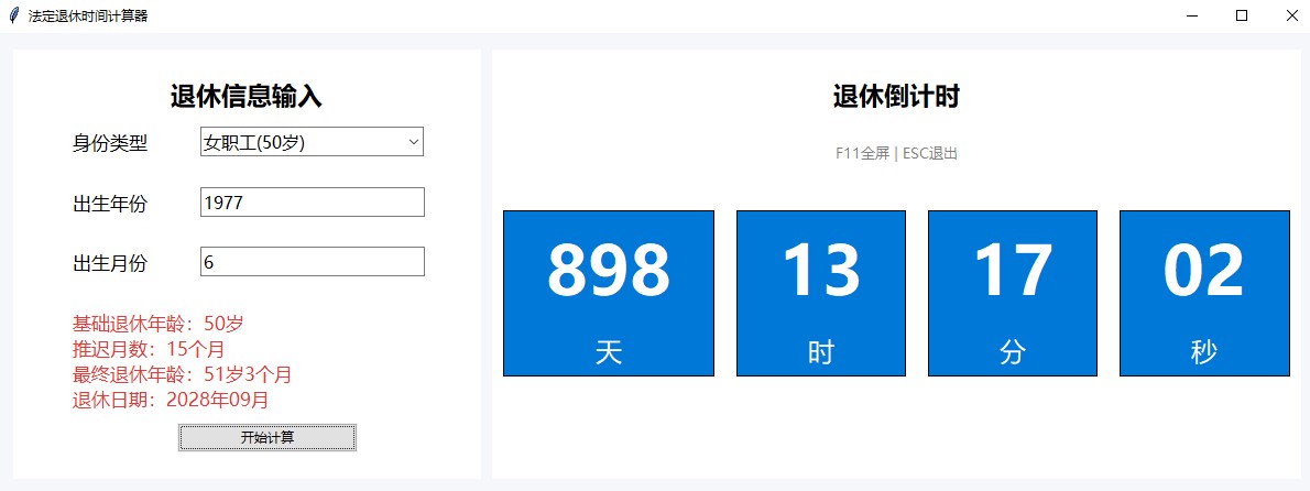 本文基于Python Tkinter开发一款可视化法定退休时间计算器,程序集成官方权威退休算法,支持男职工、女职工(50岁)、女职工(55岁)三类人群计算,具备精准退休日期推算、实时倒计时展示、全屏沉浸式查看等核心功能,界面简洁易用、计算结果权威准确,无需复杂配置即可直接运行,完美解决个人退休时间查询痛点,兼具实用性与便捷性。