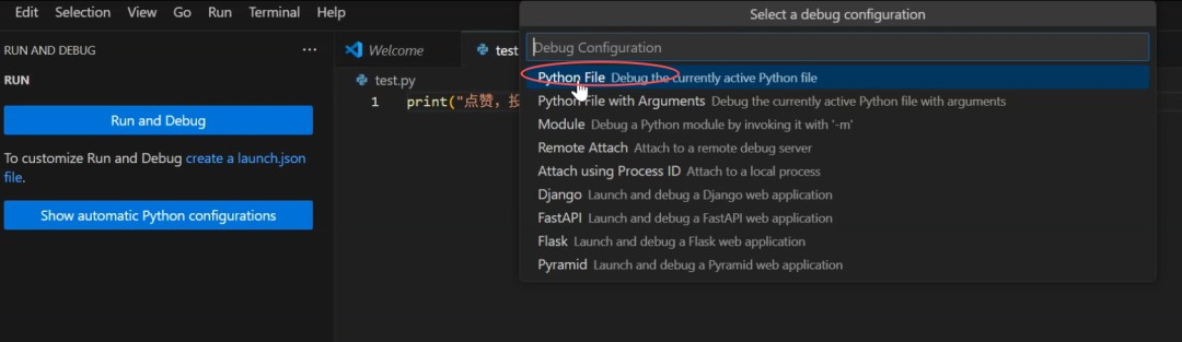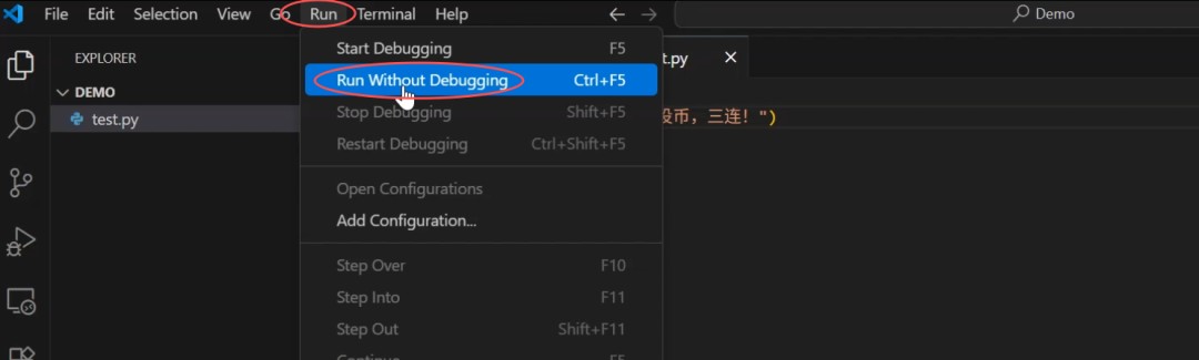 print("点赞,投币,三连!")此时你会看到 VSCode 已经有语法提示。